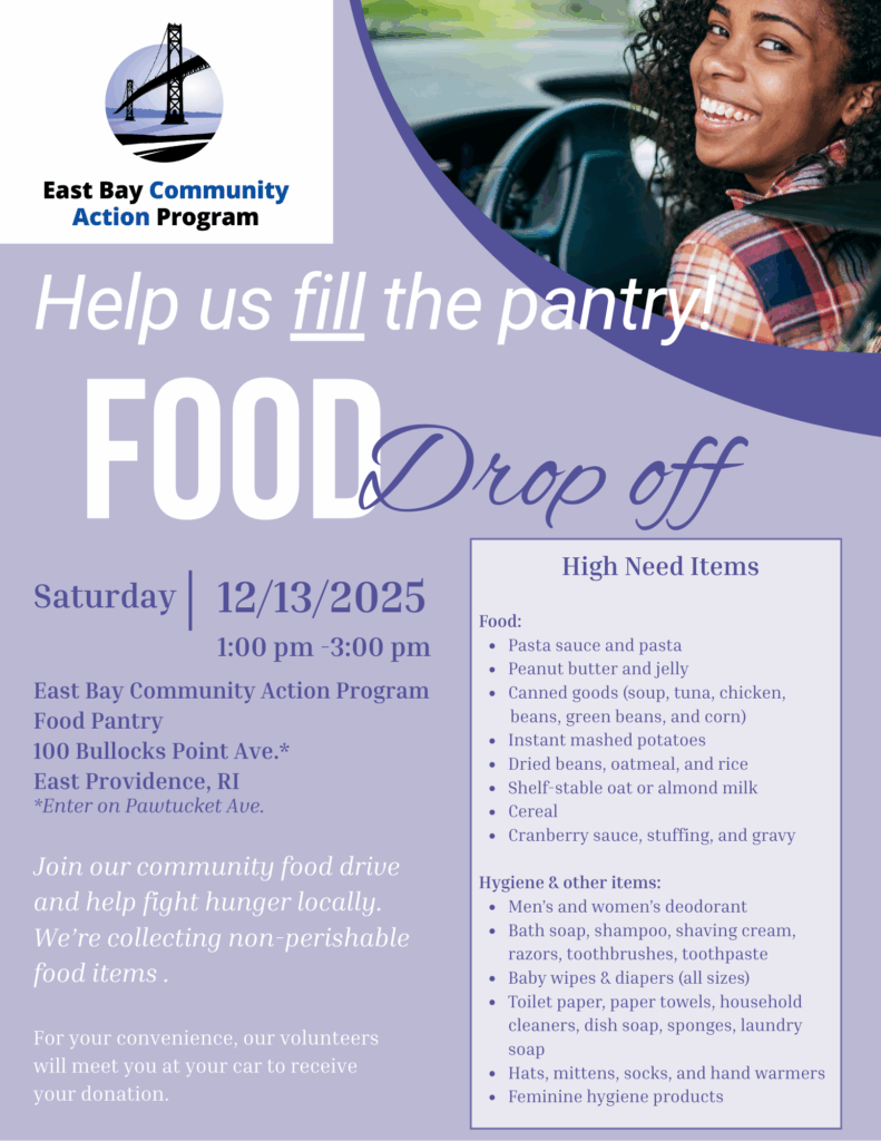 Now, more than ever, individuals and families in our community are struggling to put food on the table. East Bay Community Action Program (EBCAP) remains steadfast in its commitment to support them. Join us in the fight against hunger and help ensure our neighbors have access to nutritious meals and essential items. Your support for our food pantries, located in Tiverton, Newport, and East Providence, or our meal programs will help keep our community strong and healthy.